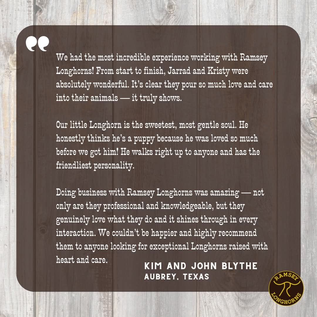 Welcome to Ramsey Longhorns Ranch. Our Longhorn journey began in 2021 when we were invited to attend the Red McCombs sale with some friends. We were just going to drink wine and enjoy the Texas Hill Country with no intention of buying any cows.